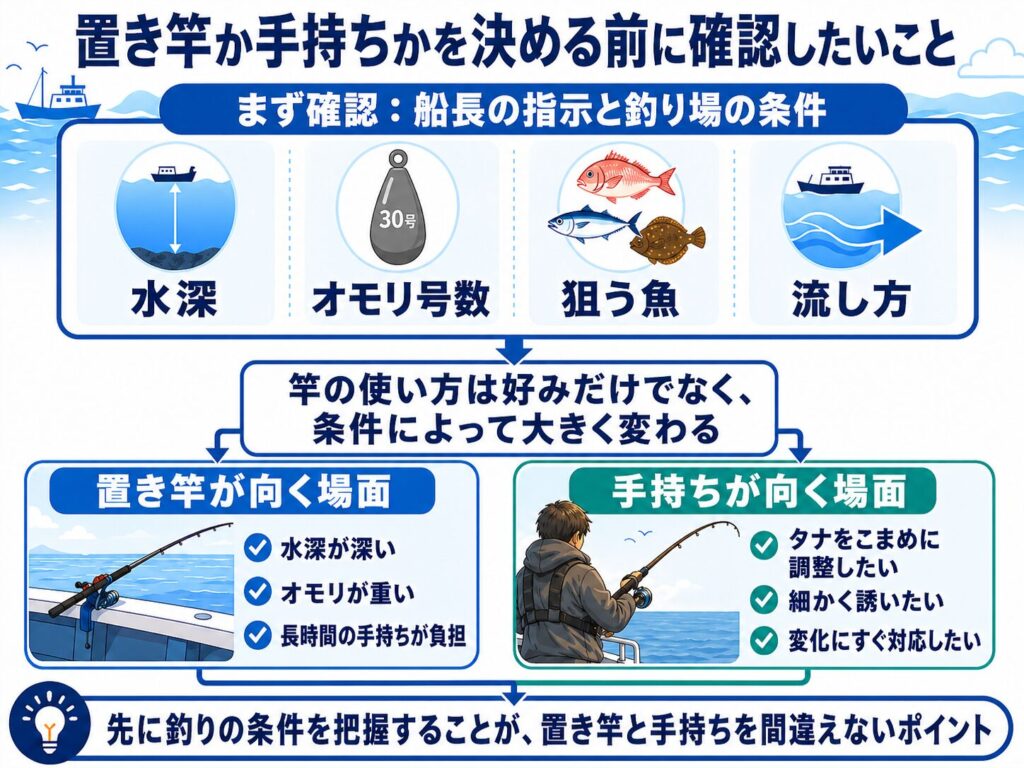 船の泳がせ釣りで置き竿か手持ちかを考える前に、まず確認したいのは船長の指示と釣り場の条件です。